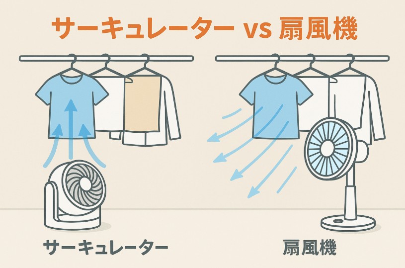 扇風機の風は、やわらかく拡散する性質を持っているため、衣類の表面をなでるように当たります。一方、サーキュレーターの風は直線的で勢いがあり、衣類の間をすり抜けるように流れます。この違いが、洗濯物の乾き方に大きな差を生むのです。