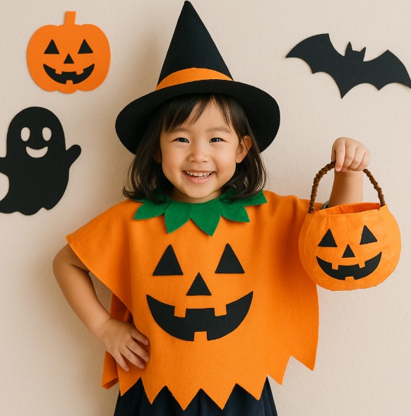 ハロウィンといえば「かぼちゃ(ジャック・オー・ランタン)」のイメージですよね。かぼちゃおばけのポンチョは、幼児〜小学生まで幅広く楽しめる仮装アイテムです。材料はオレンジ色のビニール袋や布、不織布でOK。丸く広げて中央に頭を通す穴を開け、簡単にかぶるポンチョにします。