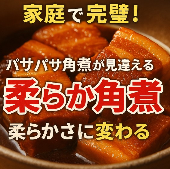 今回は「パサパサ角煮が見違える柔らかさに変わる技」をたっぷりご紹介しました。角煮が固くなる原因を知り、肉選びや下ごしらえのひと手間、火加減の使い分けを意識するだけで、家庭でも驚くほどトロトロの角煮が作れます。さらにプロが教える裏ワザや、保存とリメイクのコツを知っておけば、無駄なく美味しく楽しめます。ぜひこの記事を参考に、家族や友人に喜ばれる極上の柔らか角煮を作ってみてください!
