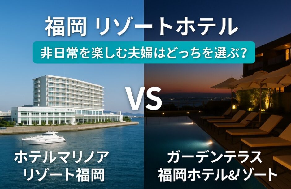福岡の人気リゾートホテルである「ホテルマリノアリゾート福岡」と「ガーデンテラス福岡ホテル&リゾート」は、いずれも非日常を味わえる魅力的な滞在先ですが、その方向性や魅せ方にははっきりとした違いがあります。